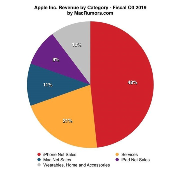 Trong quý II/2019, Apple đạt doanh thu 53,8 tỷ USD, tăng 1% so với cùng kỳ năm 2018. Doanh thu từ iPhone đạt 25,99 tỷ USD so với 29,47 tỷ USD một năm trước. Điều này đồng nghĩa iPhone đại diện chưa được một nửa doanh thu Apple lần đầu tiên kể từ 2012.