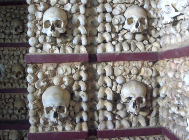 Trong khi Capela dos Ossos ở Évora, Bồ Đào Nha, trông giống như một nhà thờ nhỏ bình thường từ bên ngoài thì bên trong lại được bao phủ hoàn toàn bằng xương và sọ người.
