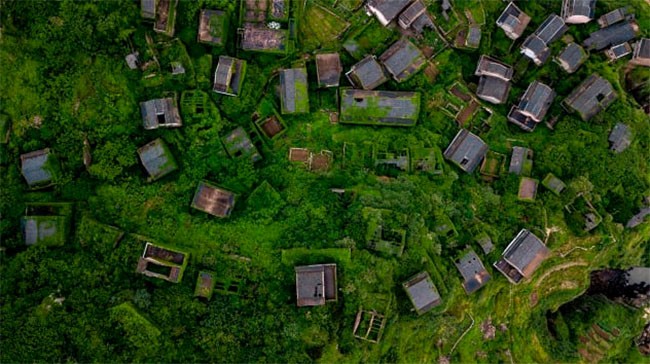 Sau nhiều thập kỷ bị bỏ hoang, những căn nhà trống hướng biển, ngôi làng ở bên vách đá vẫn tồn tại và được cây leo che phủ một màu xanh tươi.