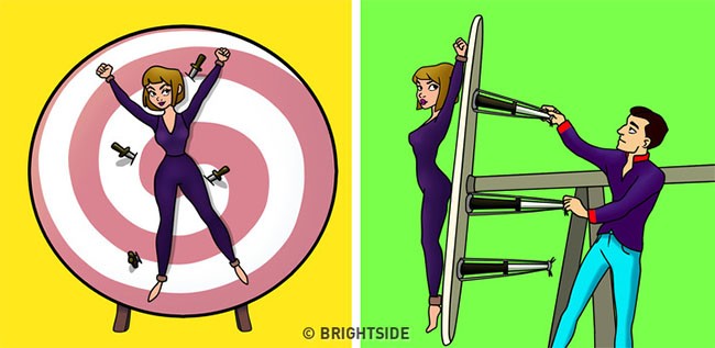Cách thực hiện: Các nhà ảo thuật không bao giờ ném dao, nhưng chỉ nhằm vào một mục tiêu và sau đó giấu dao trong một túi bí mật. Một trợ lý khác ẩn đằng sau mục tiêu và giữ một thiết bị đặc biệt bắn những con dao từ phía sau mục tiêu. Trợ lý phóng các thiết bị ngay tại thời điểm khi pháp sư “ném” con dao và nó tạo ra ảo tưởng rằng con dao bị ném vào trong mục tiêu ngay bên cạnh trợ lý.