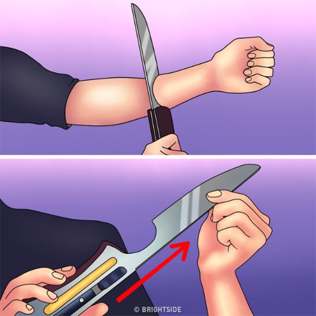 Cách thực hiện: Bí quyết nằm ở con dao. Nó có một lưỡi trượt với một rãnh hình bán nguyệt trong đó. Khi rãnh bao quanh cánh tay, khán giả sẽ tưởng lưỡi dao xuyên thẳng qua các cơ.