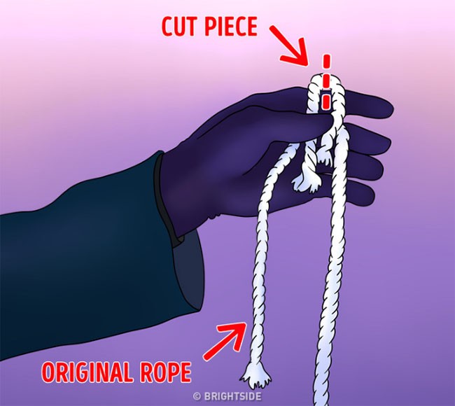 Cách thực hiện: Dưới đây là một mẹo khác mà bạn có thể tự thực hiện. Vấn đề là những gì các nhà ảo thuật cắt không thực sự là sợi dây gốc, mà là một mảnh nhỏ của một sợi dây giống hệt được xếp trong cùng một tay cầm sợi dây thừng. Nhà ảo thuật giấu mảnh cắt và cho chúng ta thấy sợi dây nguyên vẹn ban đầu.