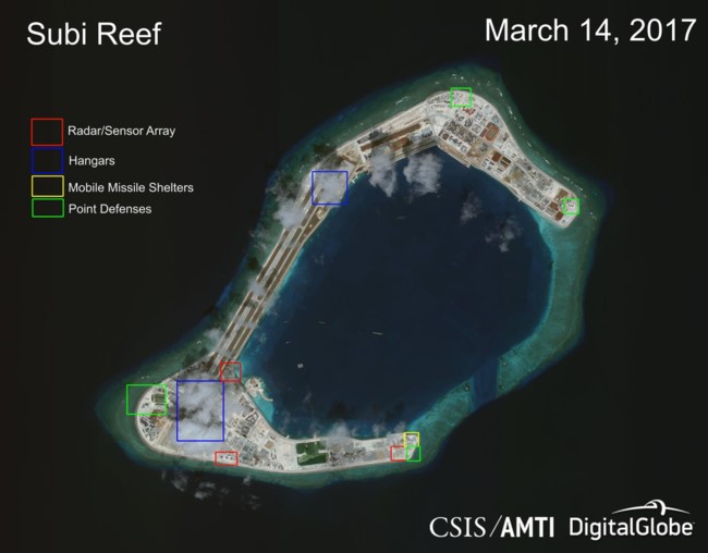 Vào tháng 3/2017, Trung tâm nghiên cứu Chiến lược và Quốc tế Mỹ - cơ quan theo dõi thường xuyên việc bồi lấp đảo phi pháp của Trung Quốc - cho biết nước này đã hoàn thành việc xây dựng trái phép trên các đảo nhân tạo.
