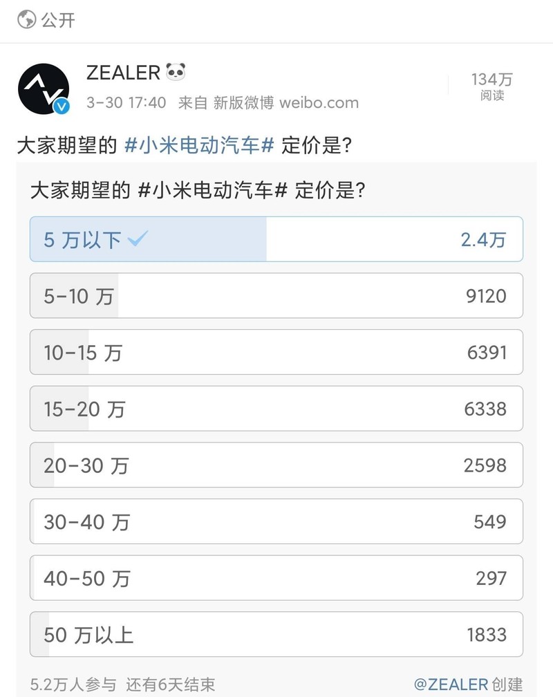 Nửa giờ sau khi Xiaomi chính thức công bố, một số phương tiện truyền thông đã thực hiện một cuộc thăm dò: "Giá ô tô điện của Xiaomi mà mọi người mong đợi là bao nhiêu?" Trong số 52.000 người tham gia bỏ phiếu, gần một nửa trong số họ chọn "dưới 50.000 nhân dân tệ (~176 triệu VND)". Khoảng 17% đầu tư chọn "50.000-100.000 nhân dân tệ (~176 - 350 triệu VND)".
