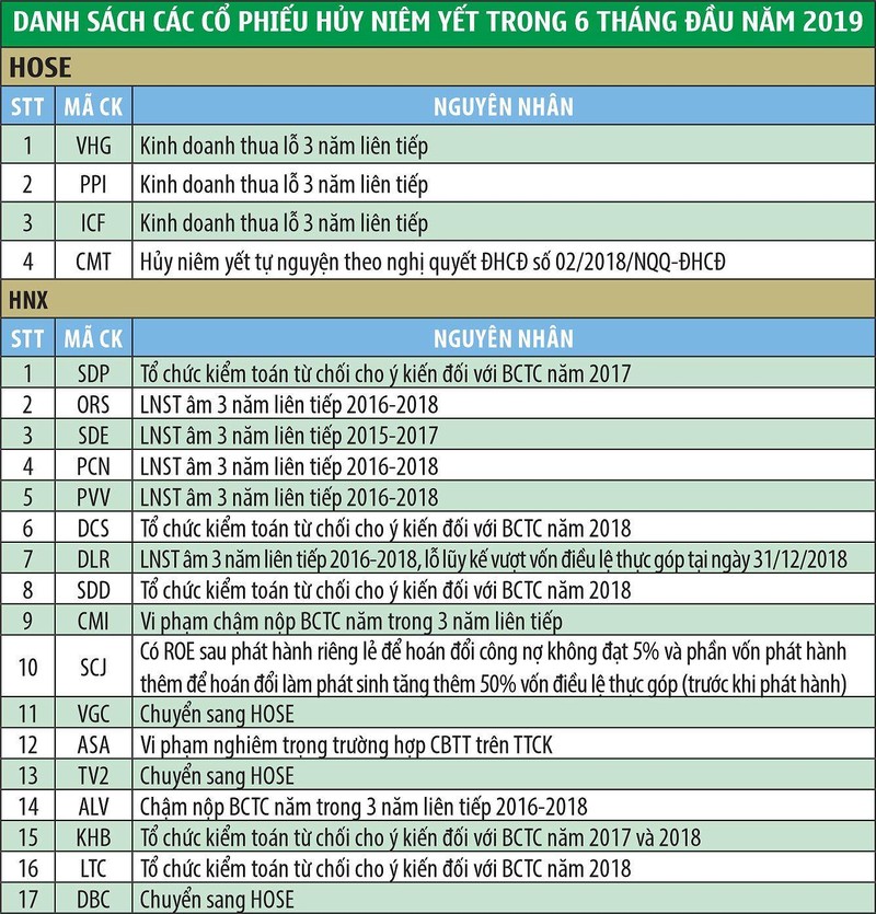 Nhìn vào lý do 16 doanh nghiệp phải rời sàn HNX trong 6 tháng đầu năm nay, sẽ thấy ngoại trừ 2 doanh nghiệp xin hủy niêm yết tự nguyện để chuyển sang sàn HOSE, 14 doanh nghiệp còn lại bị hủy niêm yết bắt buộc với lý do thua lỗ trong 3 năm liên tiếp hoặc vi phạm quy định về công bố thông tin, bị công ty kiểm toán từ chối cho ý kiến với báo cáo tài chính… Trong khi đó, với 4 doanh nghiệp rời sàn HOSE, chỉ có CMT hủy niêm yết tự nguyện, 3 doanh nghiệp còn lại xuất phát từ lý do có 3 năm liên tiếp thua lỗ.