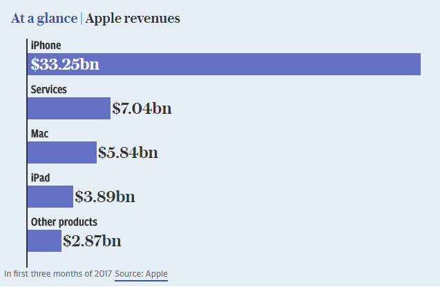 iOS đã khiến Apple phần nào gặp khó khăn trong việc cân bằng doanh thu của mình. Chiếc Apple Watch, được ra mắt vào năm 2015, có doanh thu cao hơn mọi đối thủ, nhưng vẫn bị cho là một nỗi thất vọng. Nếu tai nghe Beats và AirPod được ước tính đã chiếm 40% doanh số của tai nghe không dây vào cuối năm, chúng cũng chỉ góp phần rất nhỏ vào tổng doanh thu của công ty.