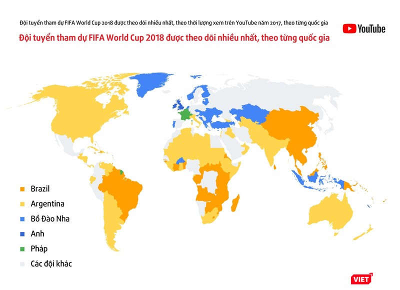 Người dùng YouTube trên toàn thế giới dành nhiều thời gian nhất để xem những video về các đội tuyển Châu Mỹ Latinh. Khi nhắc đến thời lượng theo dõi trong năm 2017, top 5 đội tuyển quốc gia phổ biến gồm có Argentina, Brazil, Peru, Bồ Đào Nha, và Mexico.