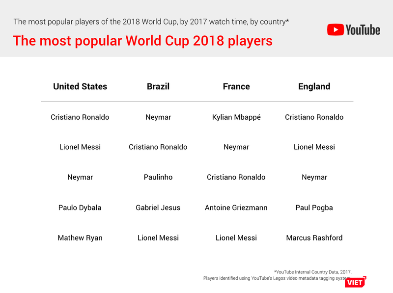 Những video của các ngôi sao bóng đá, gồm có Lionel Messi, Neymar da Silva Santos Jr. (Neymar), và Cristiano Ronaldo, đều có thời gian xem tăng mạnh lên đến 80% vào năm trước (so với năm trước đó).