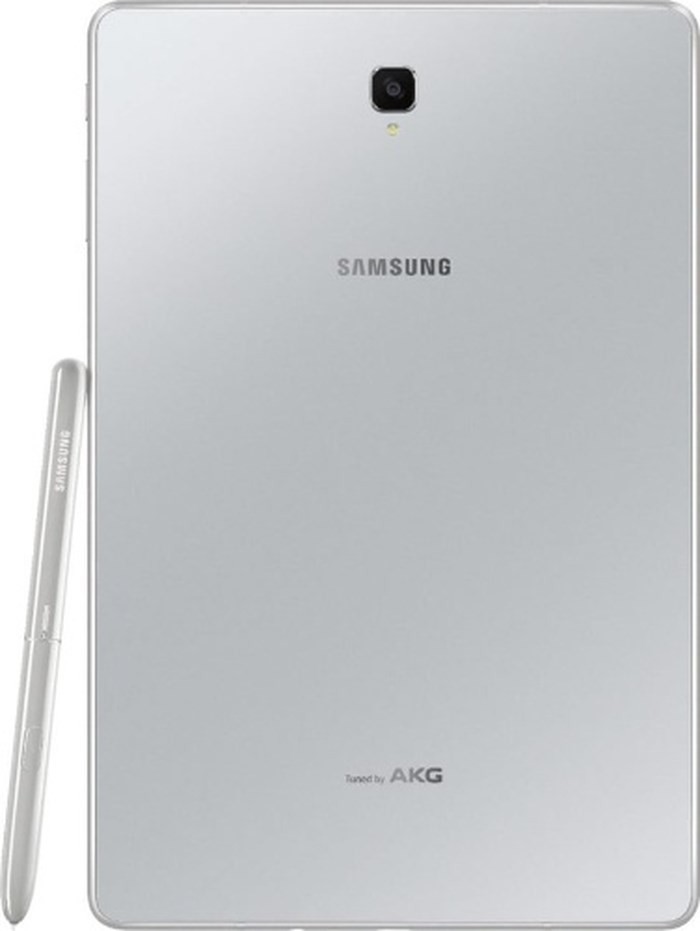 Một hình ảnh khác hiển thị mặt sau của Galaxy Tab S4 với một camera đơn và đèn flash LED ở chính giữa phía trên và phía dưới là logo của Samsung, ngoài ra còn có bút S Pen đặt bên cạnh.