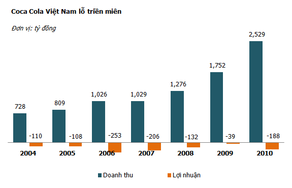 Theo đó, mặc dù doanh thu hàng năm vẫn tăng trưởng đều đặn với mức tăng trưởng bình quân 24%, đặc biệt từ năm 2008 nhưng tính đến năm 2011, Coca Cola Việt Nam đã lỗ lũy kế tới 3.768 tỷ đồng, vượt cả số vốn đầu tư ban đầu.