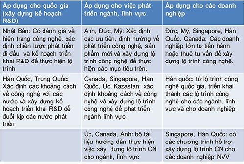 Motorola, Lucent Technologies, Philips, BP, Samsung, LG… là những tập đoàn hàng đầu thế giới đã xây dựng lộ trình công nghệ như một phần trong định hướng đổi mới của mình. Họ đã xác định lộ trình công nghệ là cơ sở cho các hoạt động quản lý và lập kế hoạch công nghệ. 80% doanh nghiệp Nhật Bản có lộ trình công nghệ riêng của mình với giai đoạn xác định từ 3 đến 5 năm. Trong năm 2002, có hơn 50% doanh nghiệp công nghệ ở Hàn Quốc đã áp dụng và triển khai xây dựng lộ trình công nghệ.