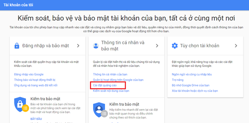 Tại giao diện quản lý tài khoản của Google, hãy nhấn chọn Ad Settings (Cài đặt quảng cáo) ở vùng Personal info and Privacy (Thông tin cá nhân và bảo mật).