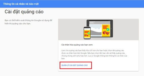Sau đó nhấn tiếp Manage ads settings (Quản lý cài đặt quảng cáo) trong trang web vừa xuất hiện.
