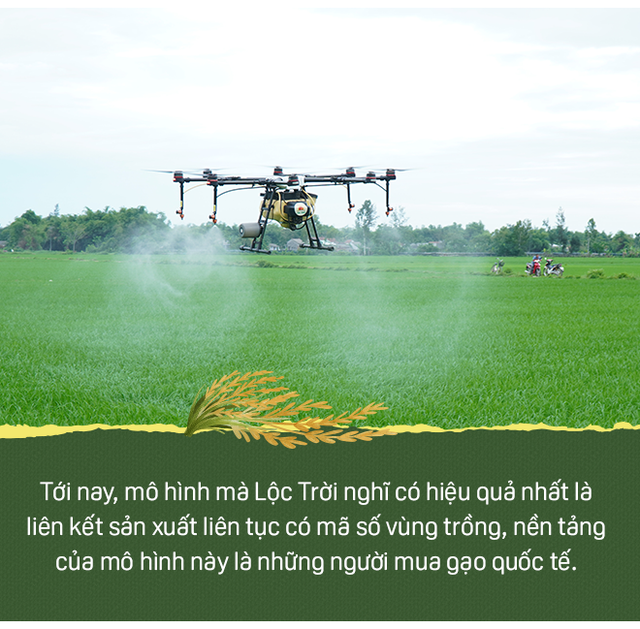 "Tới nay, mô hình mà Lộc Trời nghĩ có hiệu quả nhất là liên kết sản xuất liên tục có gắn mã số vùng trồng, dùng QR code để truy xuất nguồn gốc, nền tảng của mô hình này là những đơn hàng gạo từ người mua gạo quốc tế.