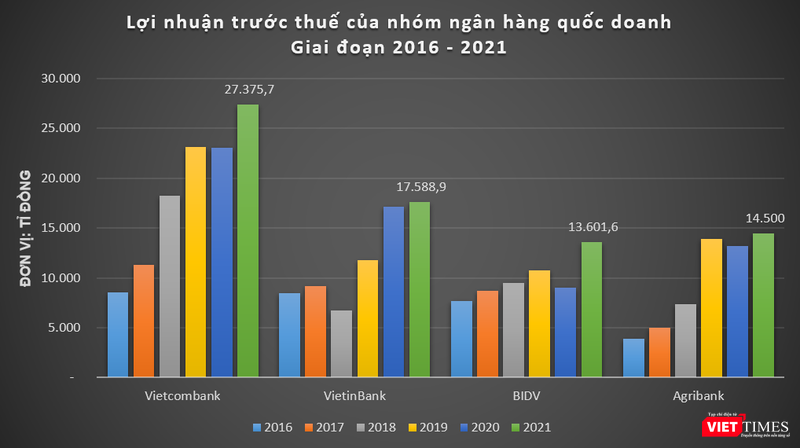 Như vậy, tổng lợi nhuận trước thuế năm 2021 của 4 ngân hàng thương mại quốc doanh (Vietcombank, VietinBank, BIDV và Agribank) là hơn 73.066 tỉ đồng, tăng khoảng 17% so với năm 2020./.