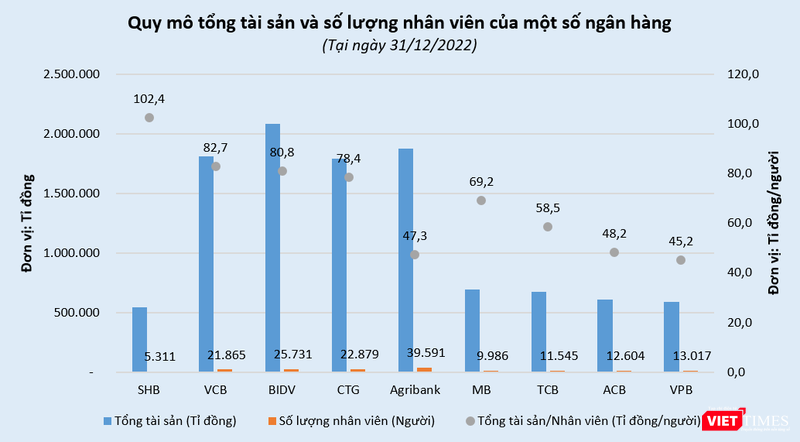 Hệ quả, tính tới cuối năm 2022, bình quân mỗi nhân viên SHB quản lý hơn 102,4 tỉ đồng tài sản - cao nhất trong số 27 ngân hàng mà VietTimes khảo sát.