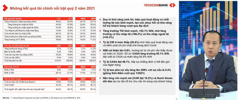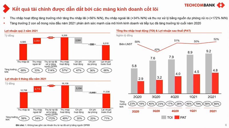 Trong nửa đầu năm 2021, Techcombank báo lãi trước thuế hơn 11,5 nghìn tỉ đồng, tăng 71,2% so với cùng kỳ năm trước. Tổng thu nhập hoạt động (TOI) của Techcombank đạt mức 18,1 nghìn tỉ đồng, tăng trưởng 52,1% so với cùng kỳ năm trước.