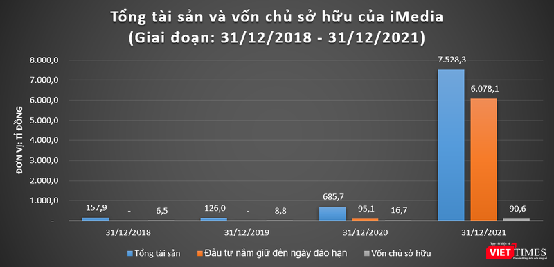 Tính đến ngày 31/12/2021, tổng tài sản của doanh nghiệp này đạt mức 7.528,3 tỉ đồng, cao gấp 10,9 lần so với đầu năm. Trong đó, các khoản đầu tư nắm giữ đến ngày đáo hạn chiếm tới 80,7% tổng tài sản, với số dư lên tới 6.078,1 tỉ đồng – cao gấp 63,9 lần so với cuối năm 2020. Các năm 2018 và 2019, iMedia đều không phát sinh các khoản đầu tư này.