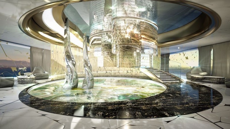 Phòng khách trung tâm có một thang cuốn xoắn ốc, được trang trí bằng đài phun nước mầu sắc...