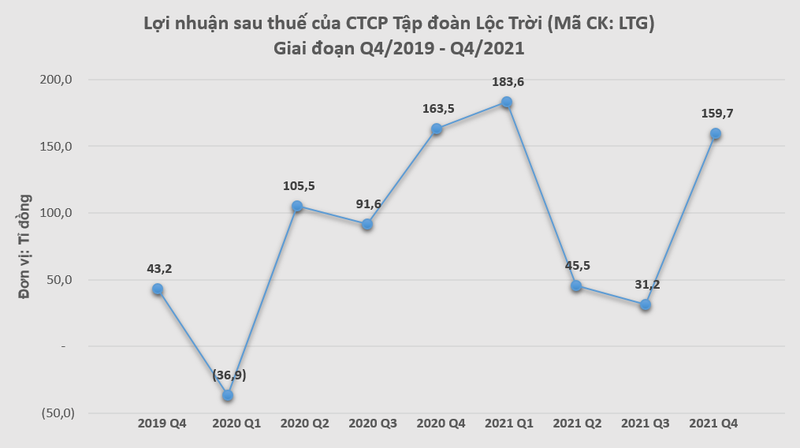 CTCP Tập đoàn Lộc Trời (Mã CK: LTG) vừa công bố kết quả kinh doanh quý 4/2021 với doanh thu thuần đạt 3.110 tỉ đồng, giảm 12% so với cùng kỳ năm trước. Lợi nhuận sau thuế của LTG đạt 159,7 tỉ đồng, giảm nhẹ 2,34% so với cùng kỳ năm 2020.