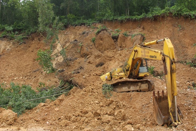 Nhiều tuyến đường ở Thanh Hóa đã bị hàng nghìn khối đất đá tràn xuống vùi lấp. Trong đó nặng nhất là tuyến quốc lộ 15A nối huyện Quan Hóa với tỉnh Hòa Bình. Trong ảnh là một chiếc máy xúc của nhà thầu thi công nâng cấp, mở rộng tuyến đường 15A bị đất đá đè trúng, vùi lấp một phần gây hư hỏng nặng.