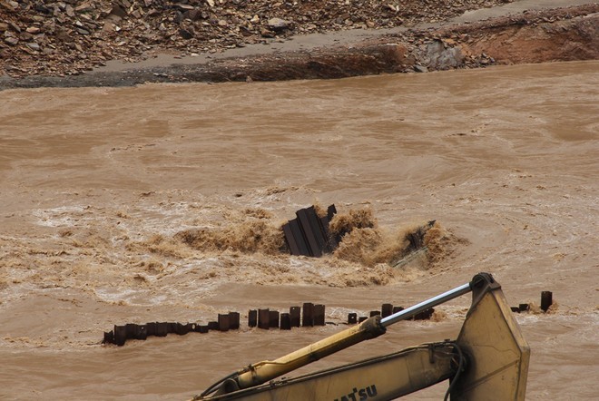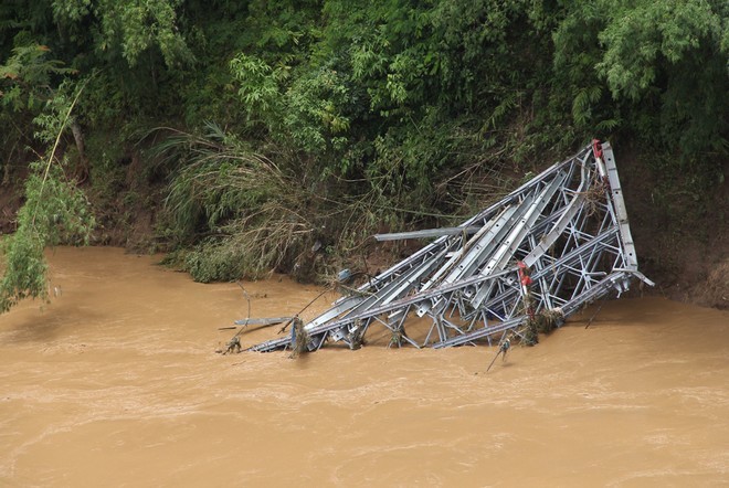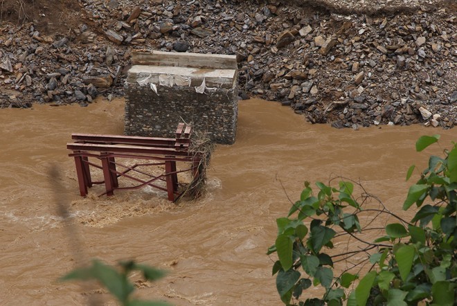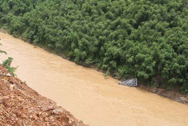 Khi nước lũ rút, một phần dầm cầu kết cấu bằng thép trôi về phía hạ lưu nhô lên bờ, cách vị trí cũ gần 100 m. Những thanh thép gãy nát, méo mó do va đập vào đá...