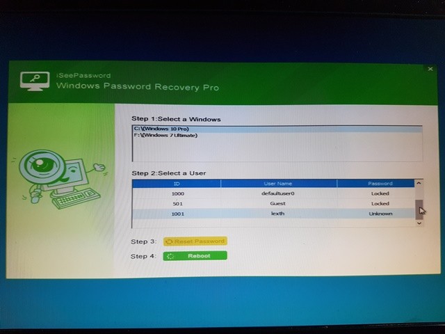 Giao diện của iSeePassword Windows Password Recovery Tool sẽ xuất hiện. Lúc này, bạn chỉ đơn giản làm theo 4 bước. Cụ thể, đầu tiên hãy lựa chọn phân vùng chứa phiên bản Windows bạn cần khôi phục lại mật khẩu, sau đó lựa nhấp chọn tên tài khoản, nhấp vào lựa chọn “Reset Password” và cuối cùng là “Reboot” là xong.