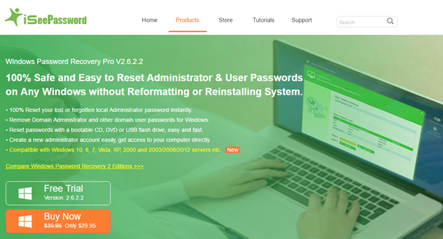 Để bắt đầu, bạn hãy truy cập vào địa chỉ này và tải về iSeePassword Windows Password Recovery Tool. Phí bản quyền của phần mềm này là 23USD, tuy nhiên bạn có thể lựa chọn dùng thử (giới hạn tính năng) nếu thích.
