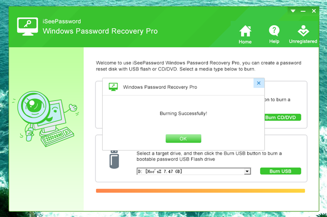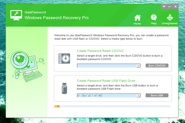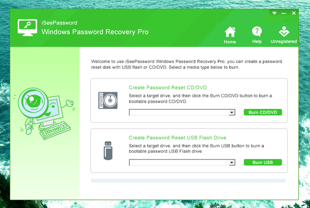 Khi đã hoàn tất việc cài đặt, bạn hãy khởi động phần mềm lên. Lúc này, bạn sẽ thấy có 2 lựa chọn giúp khởi tạo công cụ khôi phục lại mật khẩu cho Windows. Bao gồm sử dụng USB và CD/DVD. Tùy theo điều kiện hiện tại của mình mà bạn hãy nhấp vào lựa chọn tương ứng.