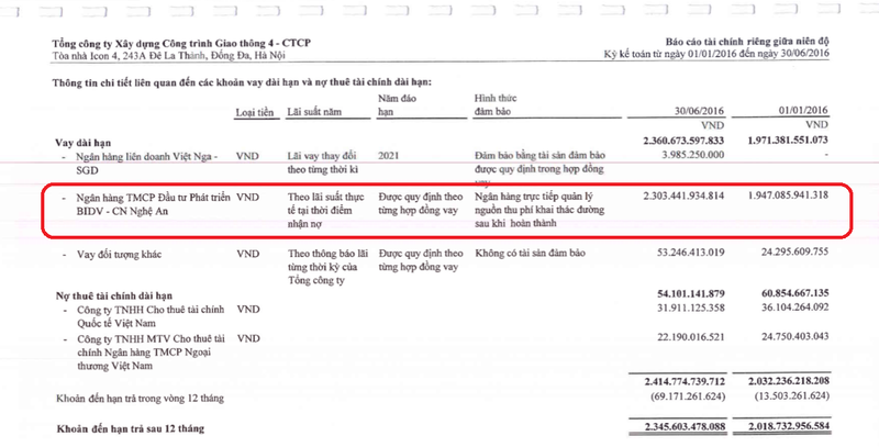 Theo đó, tính đến ngày 30/06/2016, BIDV – Chi nhánh Nghệ An đang cho Cienco 4 vay 3.077 tỷ đồng (trên tổng số 3.638 tỷ đồng nợ vay tài chính của công ty), trong đó có 774 tỷ đồng ngắn hạn và 2.303 tỷ đồng dài hạn (vay dài hạn đến hạ trả là 56 tỷ đồng). Thuyết minh cho hay, hình thức đảm bảo cho khoản vay dài hạn của Cienco 4 tại BIDV – Chi nhánh Nghệ An, đó là “ngân hàng trực tiếp quản lý nguồn thu phí khai thác đường sau khi hoàn thành”.