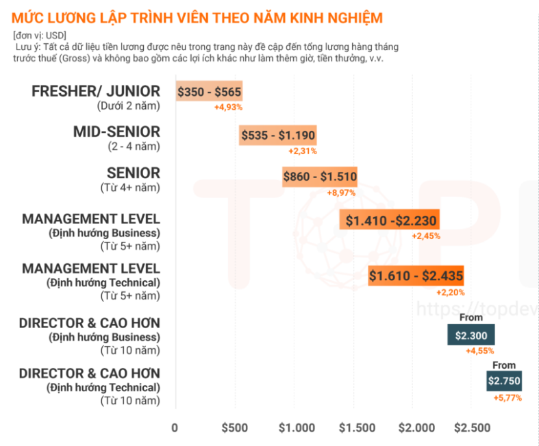 Đối với các lập trình viên từ 5 năm kinh nghiệm trở lên, mức lương chênh lệch chủ yếu dựa trên vị trí và trách nhiệm đối với hoạt động kinh doanh, dao động từ 2.230 – 2.435 USD/tháng (tương đương 53 – 57,9 triệu đồng/tháng).