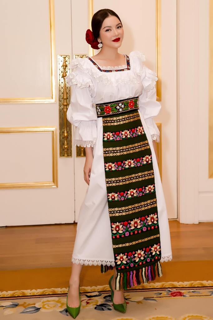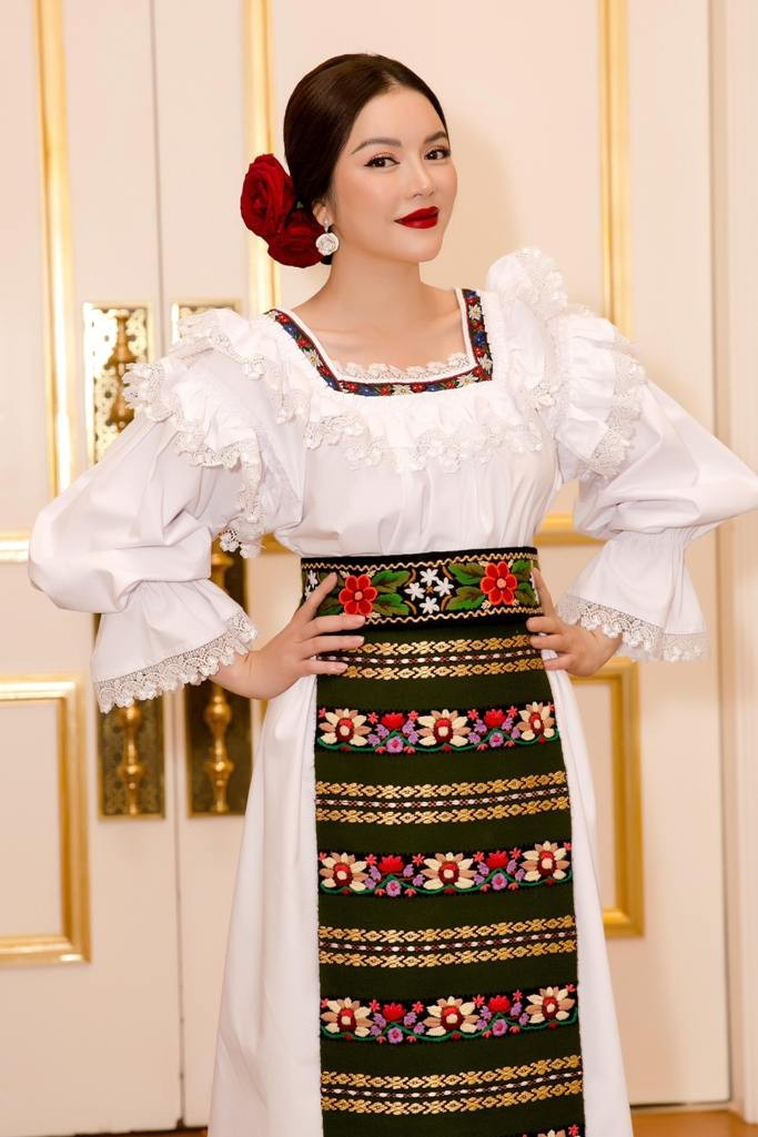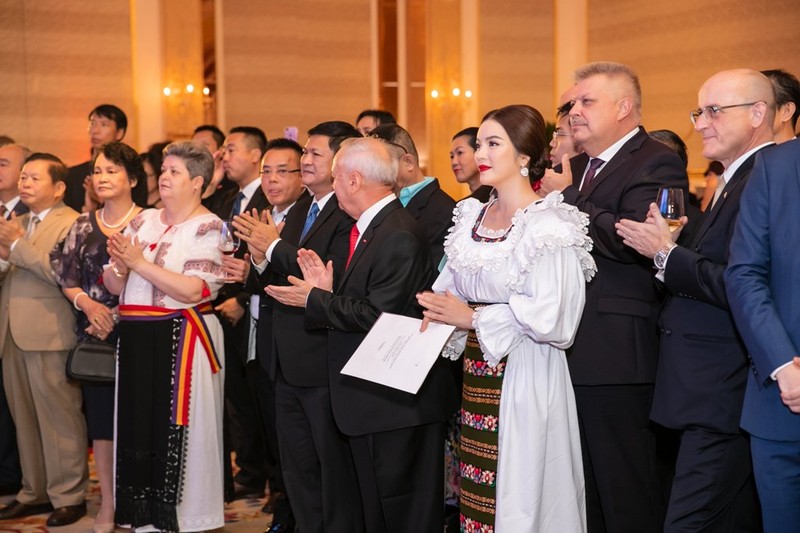 Trong trang phục truyền thống của Romania, bà Trần Thị Thanh Nhàn phát biểu tại lễ kỷ niệm, bày tỏ vui mừng được đóng góp sức mình vào việc thúc đẩy quan hệ hợp tác giữa hai nước.