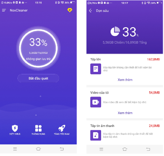 - Dọn dẹp điện thoại: quét rác giúp giải phóng bộ nhớ hơn gấp nhiều lần so với hầu hết các ứng dụng cùng loại.