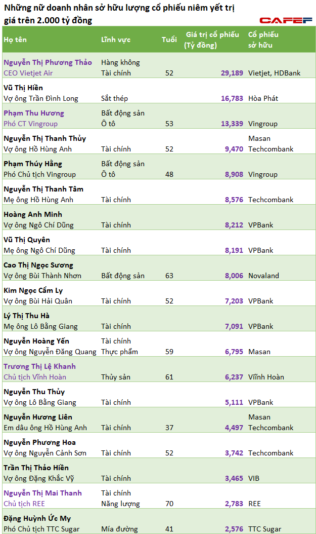 Ngoài ra, trong danh sách này còn có bà Cao Thị Ngọc Sương (vợ ông Bùi Thành Nhơn - Chủ tịch Nova Group) nắm giữ 8.006 tỷ đồng, bà Kim Ngọc Cẩm Ly (vợ ông Bùi Hải Quân - Phó Chủ tịch VPB) nắm giữ 7.203 tỷ đồng, bà Lý Thị Thu Hà (mẹ ông Lô Bằng Giang - Phó Chủ tịch Vp Bank) nắm giữ 7.091 tỷ đồng,...