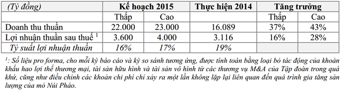 Các khoản đầu tư lớn vào tài sản cố định theo kế hoạch trong năm 2015 dự kiến từ 2.000 tỷ đồng đến 2.500 tỷ đồng. Kế hoạch này không bao gồm các thương vụ M&A tiềm năng, vốn phụ thuộc vào điều kiện thị trường và tùy theo cơ hội có thể nắm bắt.