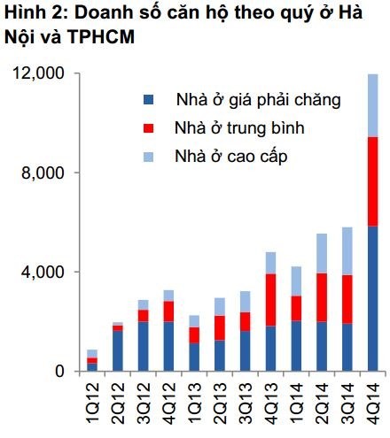 Trong các phân khúc căn hộ, lượng tiêu thụ thành công của phân khúc nhà ở giá phải chăng chiếm một tỷ trọng lớn nhất trong các phân khúc thị trường. Tuy nhiên, phân khúc nhà ở cao cấp cũng chứng kiến sự tăng trưởng vượt bậc so với năm 2012. Nguồn: VCSC/CBRE