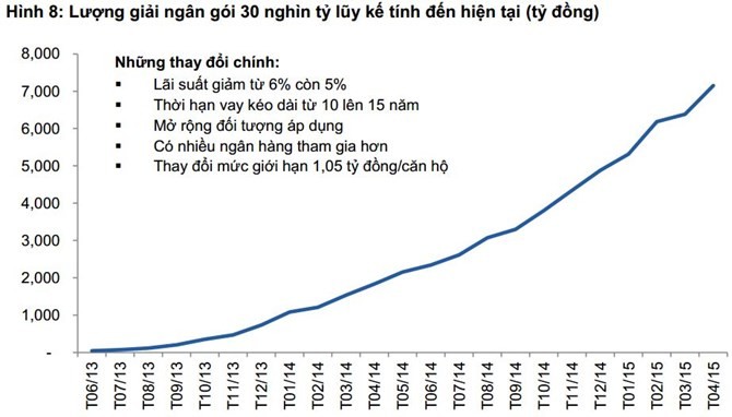 Mặc dù không được như kỳ vọng ban đầu, tuy nhiên, lượng giải ngân gói hỗ trợ nhà ở 30.000 tỷ đồng đã tăng khá mạnh trong giai đoạn cuối năm 2014 và nửa đầu năm 2015. Nguồn: VCSC/Bộ Xây dựng