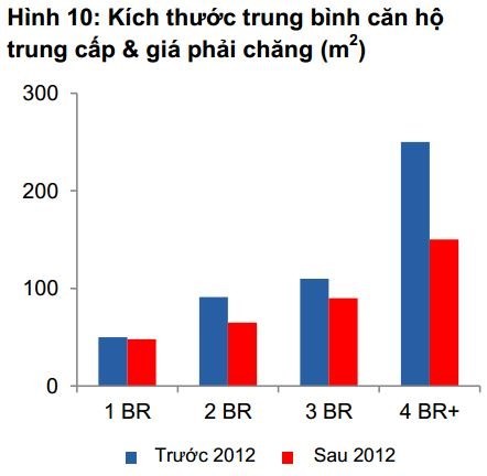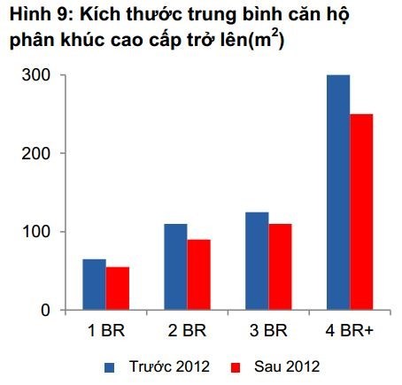 Sự thay đổi trên thị trường căn hộ cao cấp thể hiện rõ nét nhất ở việc các chủ đầu tư đã giảm đáng kể diện tích căn hộ so với năm 2012. Nguồn: VCSC/CBRE