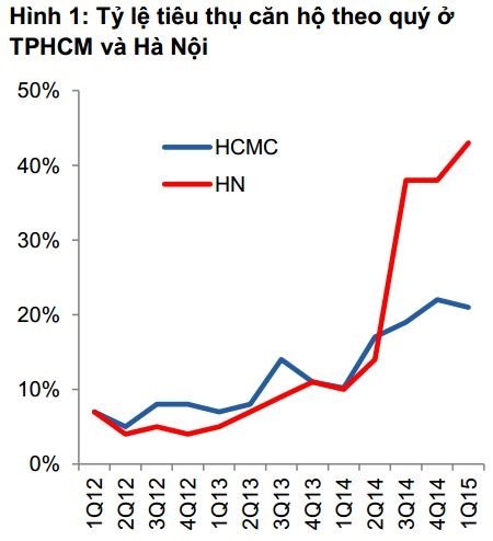 Lượng căn hộ tiêu thụ thành công ở cả thị trường Hà Nội và TP.HCM đều tăng mạnh trong 3 năm gần đây. Nguồn: VCSC/Savills
