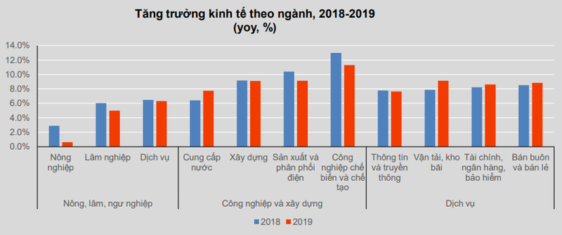 Tăng trưởng của khu vực công nghiệp xây dựng trong các năm 2018 và 2019 là xấp xỉ nhau (ở quanh mức 8,9%) nhưng khi nhìn vào từng ngành nhỏ lại cho thấy đa số có kết quả tăng trưởng thấp hơn.