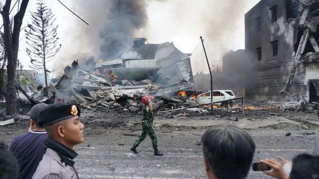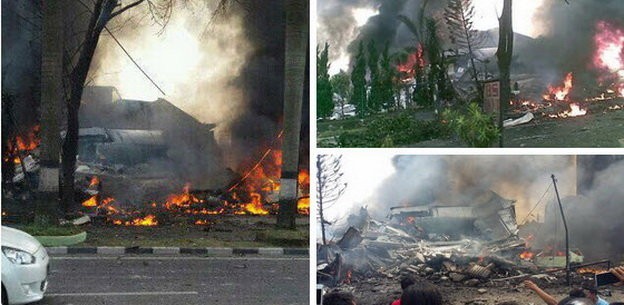Theo RT, máy bay gặp nạn là máy bay quân sự, nó rơi trúng một khách sạn ở TP Medan, đảo Sumatra. Truyền thông địa phương dẫn nguồn tin một quan chức Không lực Indonesia cho biết trên máy bay khi đó có 12 thành viên phi hành đoàn, còn số người đi cùng thì chưa rõ.
