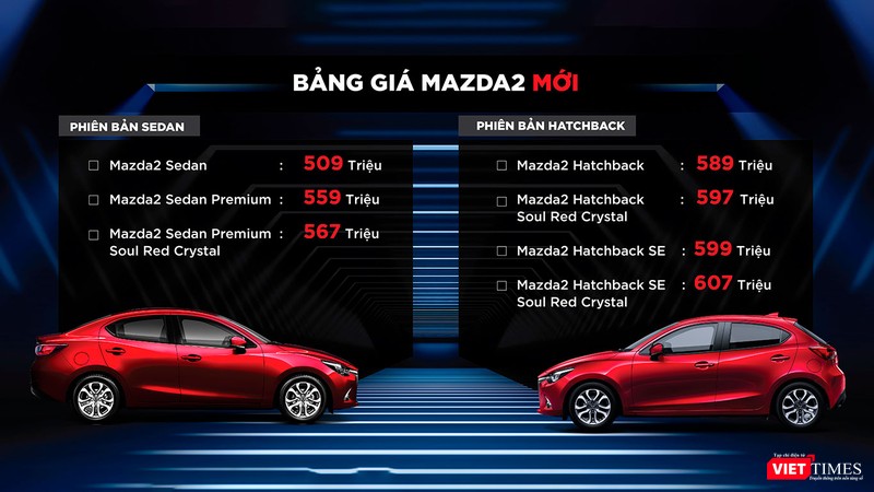 Riêng tùy chọn màu đỏ mới (Soul Red Crystal) trên mô hình Sedan và Hatchback sẽ có giá cao hơn 8 triệu đồng so với các màu thông thường khác. Dưới dây là giá bán chi tiết của từng phiên bản Mazda 2 2018: