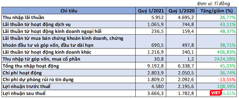 Trong đó, thu nhập lãi thuần đạt 5.952 tỉ đồng, tăng 26,8% so với cùng kỳ. Lãi thuần từ hoạt động dịch vụ và kinh doanh ngoại hối đạt lần lượt 1.066 tỉ đồng và 236,5 tỉ đồng, tăng 43% và 48,3%.
