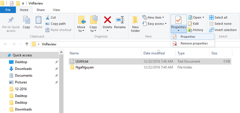 1. Đầu tiên, bạn mở File Explorer và di chuyển đến file hoặc thư mục bạn muốn ẩn. Kế đến, bạn chọn file hoặc thư mục đó và nhấn nút Properties > Properties từ thanh Ribbon. Hoặc bạn cũng có thể nhấn chuột phải lên file hoặc thư mục và chọn Properties.