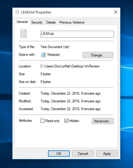 Bạn có thể thực hiện tương tự nếu muốn ẩn file của riêng bạn, chỉ cần thay đường dẫn trong dấu nháy kép bằng đường dẫn đến file hoặc thư mục của bạn. Nếu muốn hiện file trở lại, bạn hãy thay dấu cộng (+) trong câu lệnh attrib bằng dấu trừ (-).