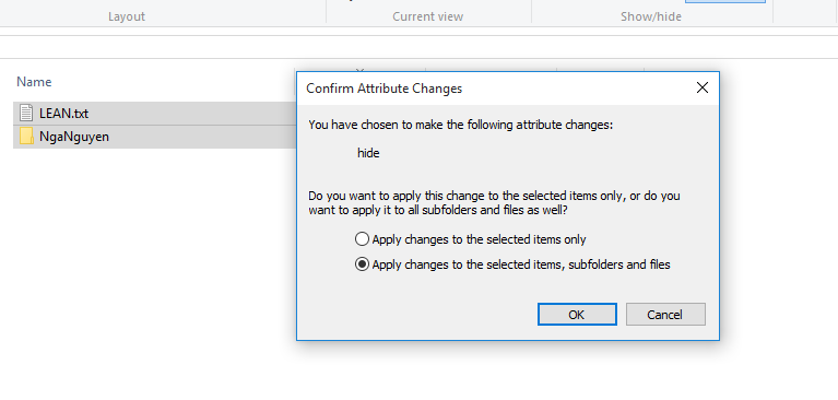 Khi nhấn nút này, một hộp thoại sẽ hiện ra yêu cầu bạn xác nhận các thay đổi. Nó cũng hỏi bạn có muốn ẩn các thư mục con (sub-folder) và các file bên trong chúng (nếu có). Hãy chọn các tùy chọn phù hợp với nhu cầu của bạn và nhấn nút OK.