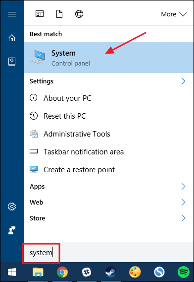 Trước hết, bạn nhấn phím Start, gõ từ khóa system, và sau đó nhấn phím Enter hoặc chọn mục System từ danh sách kết quả.