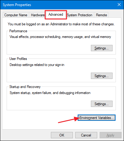 Kế đến, bạn nhấn nút Environment Variables từ thẻ Advanced của cửa sổ System Properties.