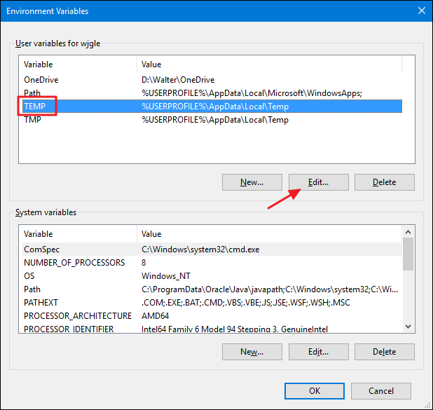 Bây giờ, bạn hãy chọn biến TEMP và sau đó nhấn nút Edit.