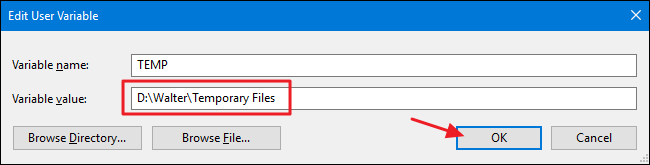 Tại cửa sổ Edit User Variables, bạn gõ đường dẫn mới cho biến TEMP vào ô Variable value. Hoặc bạn có thể nhấn nút Browse Directory để duyệt đến vị trí mong muốn. Nếu bạn sử dụng nút Browse Directory, bạn cần tạo trước thư mục Temp tại vị trí bạn muốn đặt nó và sau đó chọn đến thư mục đó. Sau khi đã chọn vị trí mới, bạn nhấn nút OK.